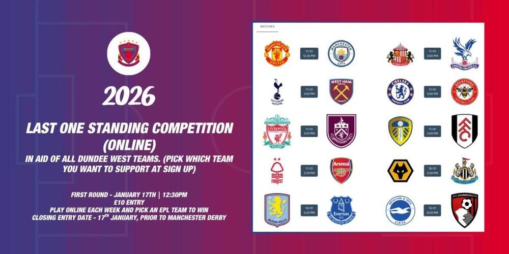 After a successful Last One Standing (LOS) competition in the first half of the season, where £900 was raised across the West teams and 2 lucky people shared the £900 jackpot ( a nice Xmas present) we are back with our second LOS Comp for the second half of the English Premier League season.
